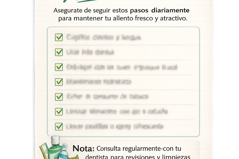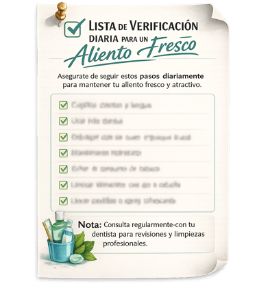 Diseñada para colocar en el baño o en tu agenda, esta lista funciona como un recordatorio visual simple y efectivo para cuidar tu aliento todos los días y reforzar tu confianza en las relaciones.